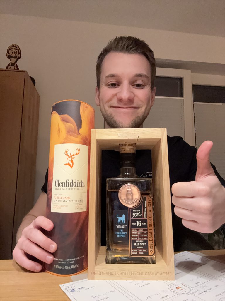 Diesen Tag gab es jedoch gleich 2 Premieren: Zum ersten Mal in der Spritti-Geschichte wurde ein Tasting live auf Twitch gestreamt. Zwischenzeitlich gab es mit Simon sogar auch einen Zuschauer. Die andere Primäre bestand darin, dass es einen einstimmigen Favoriten gab. Den Glenfiddich Fire & Cane von Marius.